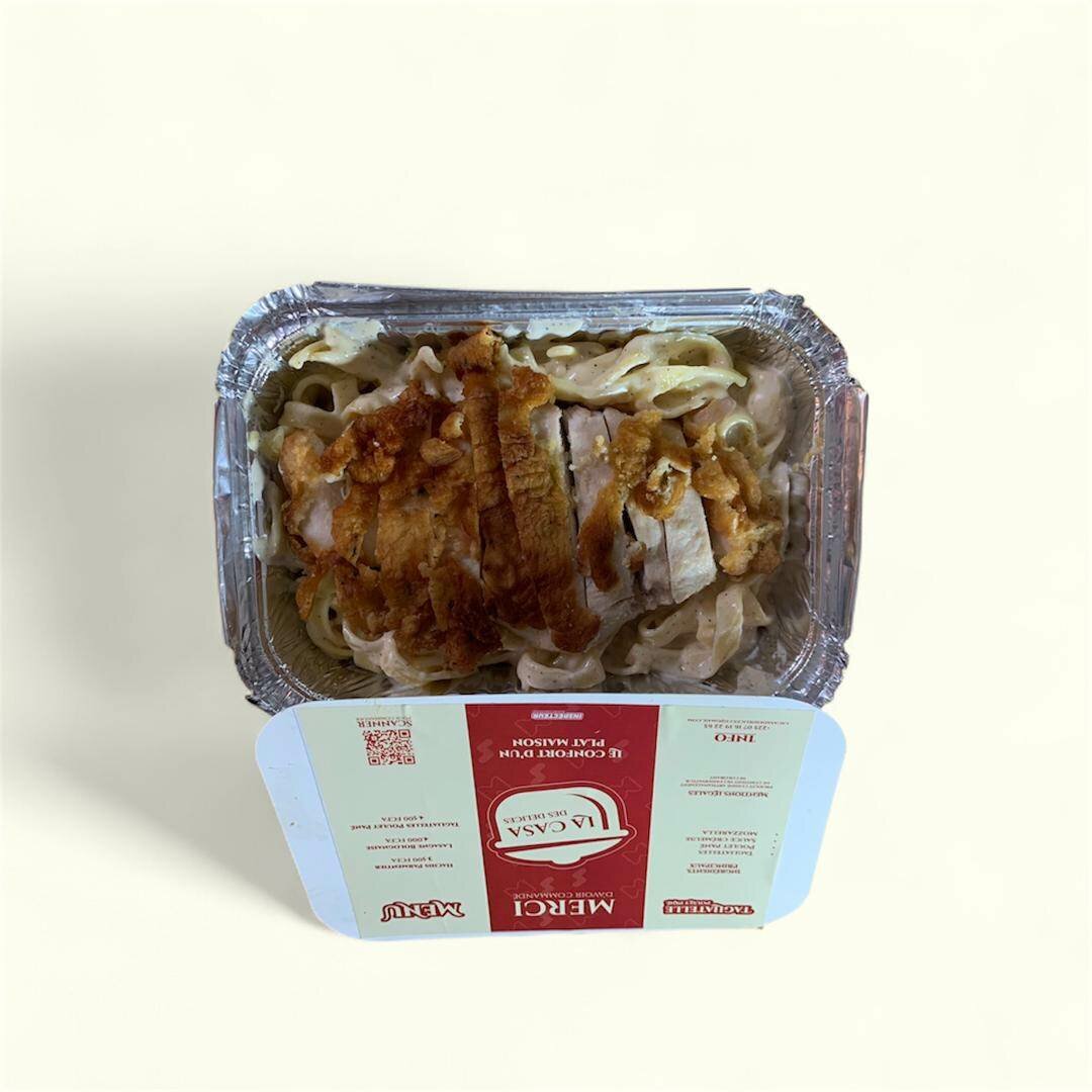 Des pâtes fraîches accompagnées dun filet de poulet croustillant et doré, le tout sublimé par une sauce onctueuse.