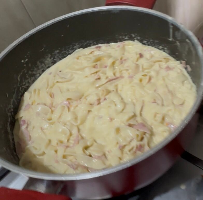 Tagliatelles aux jambons , crevettes et poulet
