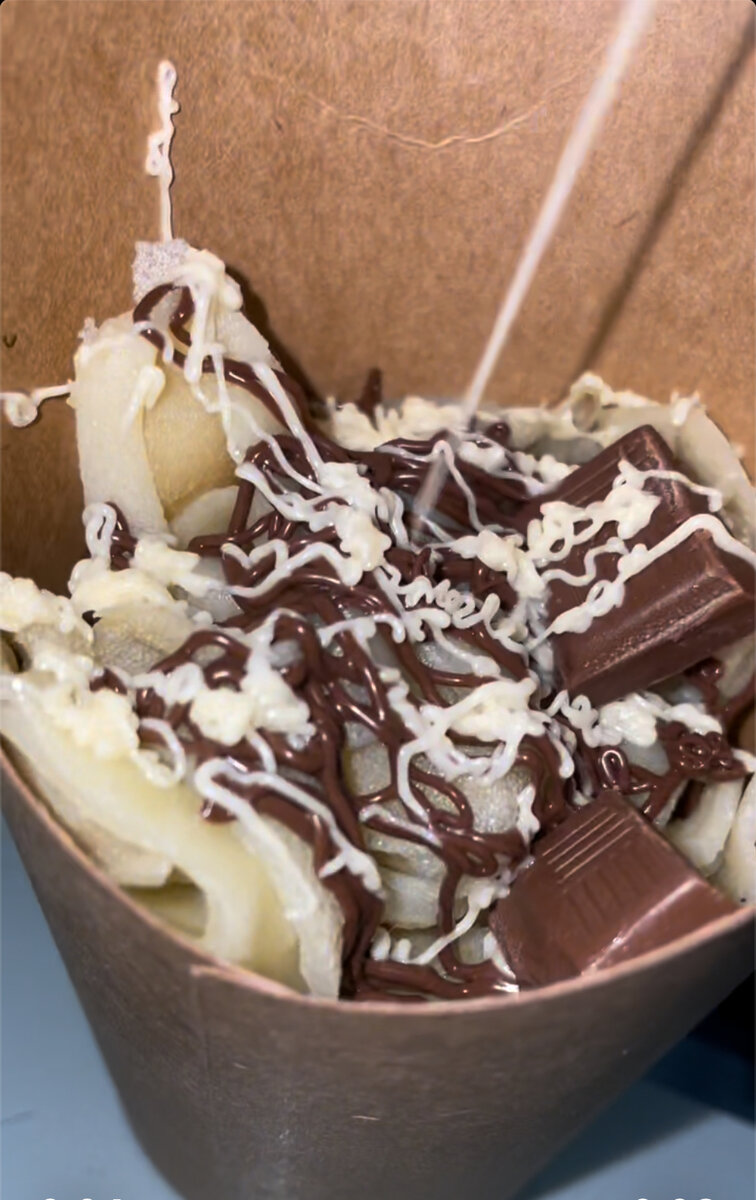 Savourez cette crêpe gourmande garnie de chocolat fondant et de noix croquantes. Parfaite pour une pause sucrée à tout moment de la journée. Un délice à ne pas manquer pour les amateurs de douceurs.