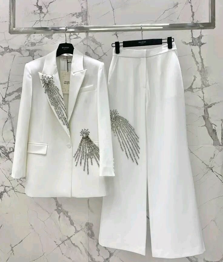 Ce tailleur blanc élégant est parfait pour les occasions spéciales. Son design raffiné, orné de strass scintillants, ajoute une touche de glamour. Confortable et chic, il est idéal pour les soirées et événements formels. Faites une impression avec ce tailleur remarquable!