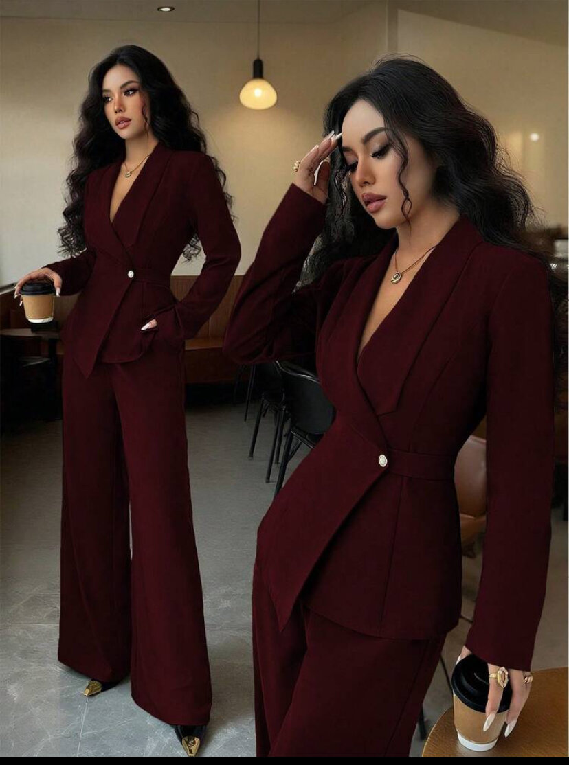 Ce tailleur pantalon bordeaux élégant est parfait pour les occasions professionnelles et les événements formels. Fabriqué avec des matériaux de haute qualité, il offre confort et style. L'ajustement flatteur et la couleur audacieuse font de ce costume un choix incontournable pour celles qui souhaitent faire une impression durable.