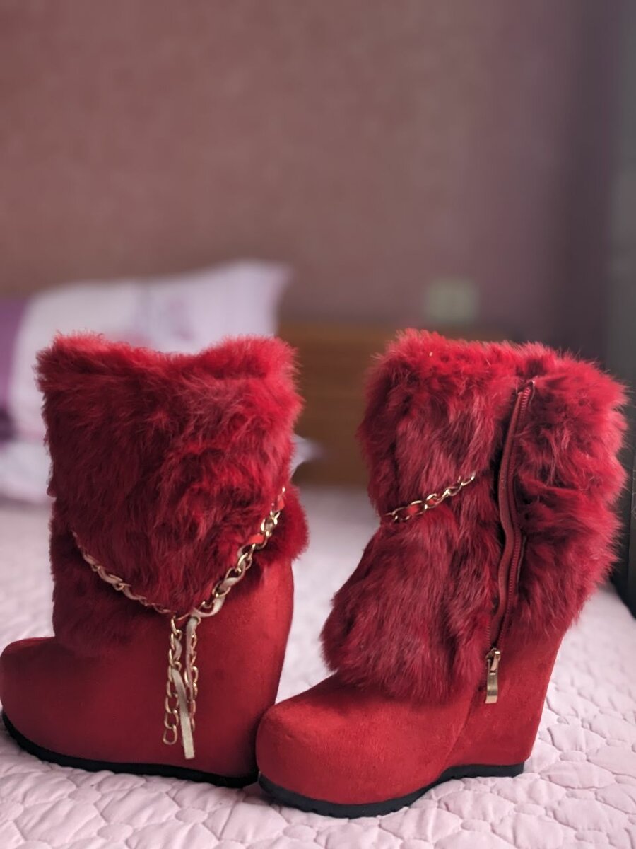 Натуральный мех 34 размер, красные на платформе, черные на каблуке и платформе б/у отличное состояние. Каждая пара 2000 сом