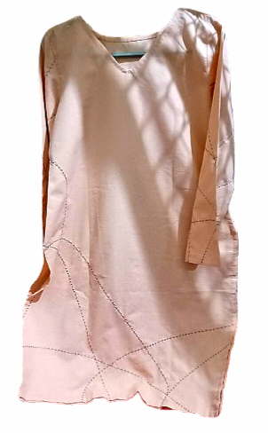 1 pc stitched embroidered light weight khaddar shirt Shirt size: 12/M Shirt length: 39 inches Fabric : Light weight khaddar Machine tilla embroidery in geometric motifs at front daman and sleeves Embroidery thread color: cobalt