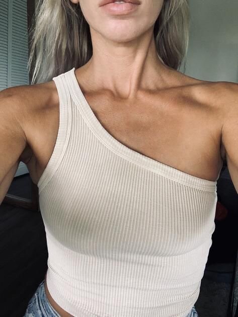 Tank top asymétrique en coton blanc, confortable et élégant. Idéal pour les tenues décontractées ou pour se combiner avec d'autres vêtements. Tissu en maille côtelée pour un ajustement parfait.