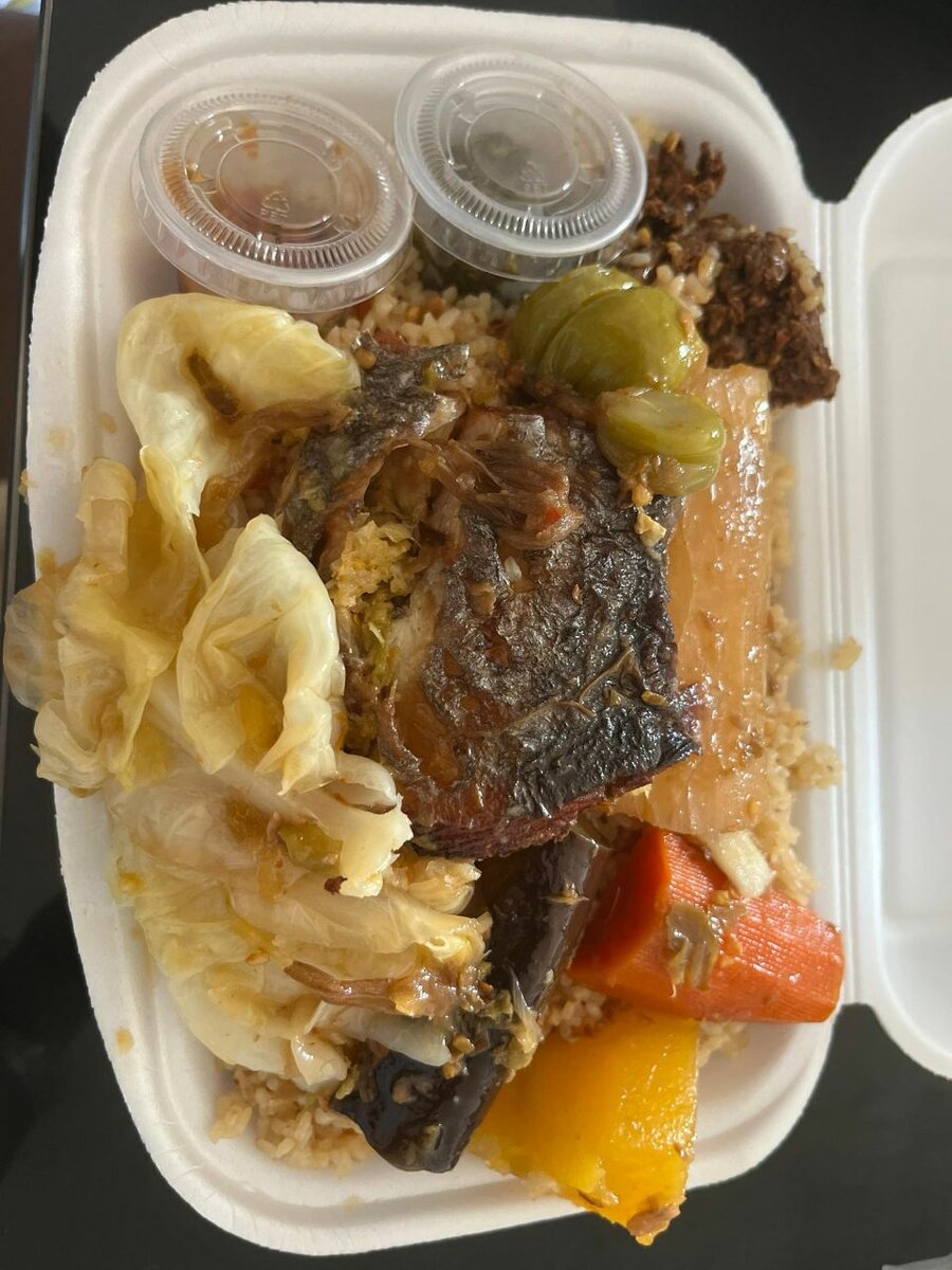 Savourez un délicieux plat à emporter avec du riz parfumé, légumes variés et viande tendre, accompagné de sauces savoureuses.