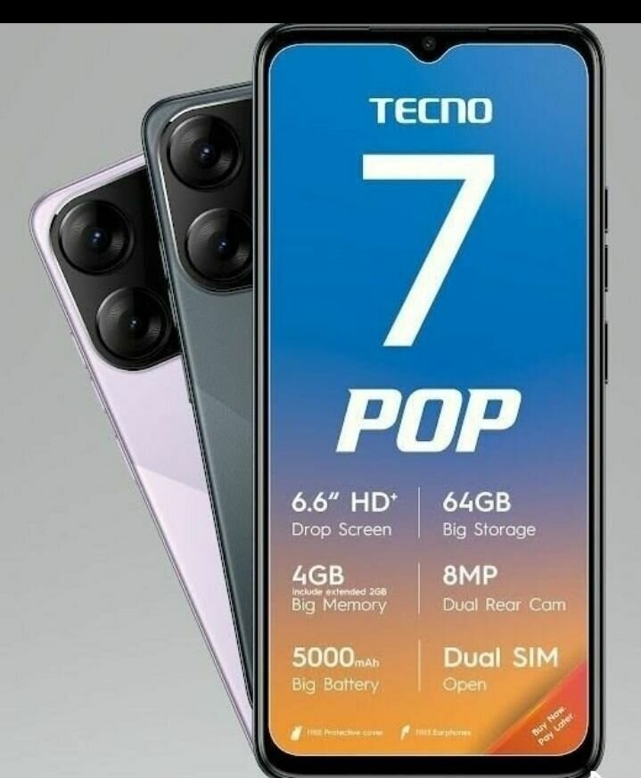 Découvrez le TECNO 7 POP : écran HD 6.6", stockage 64GB, 4GB RAM. Caméra arrière double 8MP, batterie 5000mAh, Dual SIM. Parfait pour un usage quotidien et divertissant.