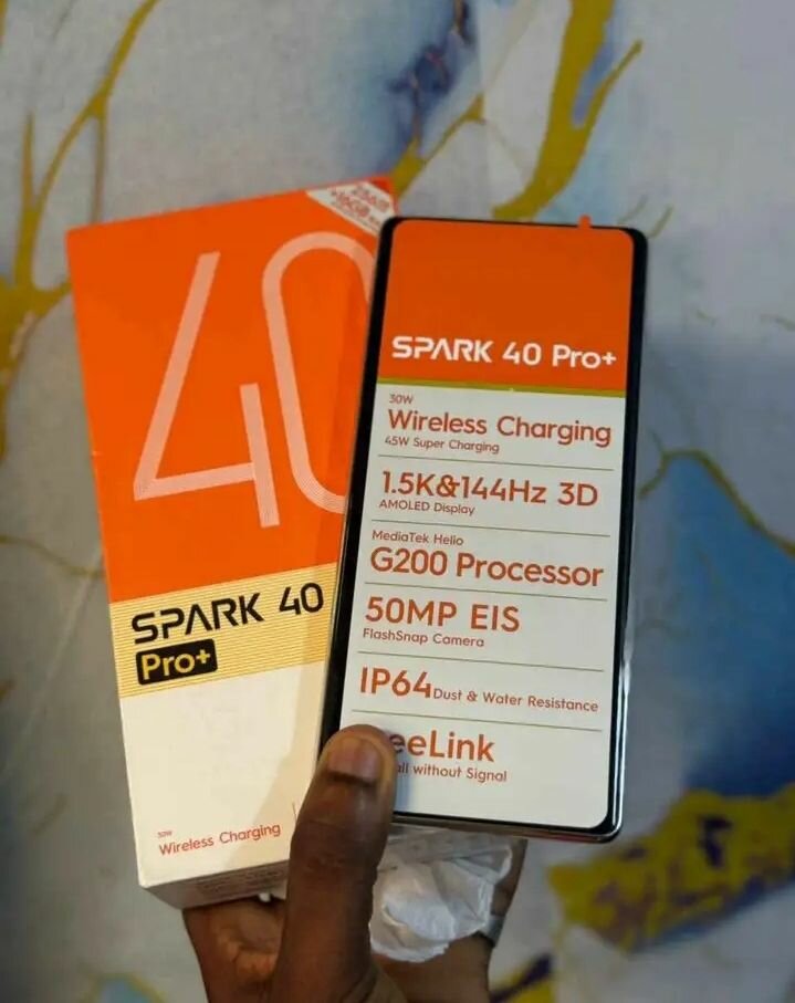 Découvrez le Tecno Spark 40 Pro+, smartphone performant avec 8Go de RAM et 256Go de stockage. Écran AMOLED 1.5K, processeur G200, appareil photo 50MP EIS et charge sans fil.