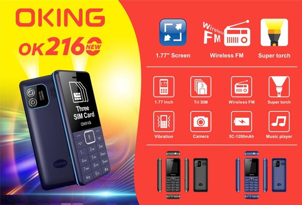 Téléphone OKING OK5619m avec écran 1.77", triple SIM et caméra. Profitez de la radio FM sans fil et d'une grande autonomie avec une batterie de 2500mAh. Idéal pour ceux qui cherchent un appareil polyvalent et pratique.