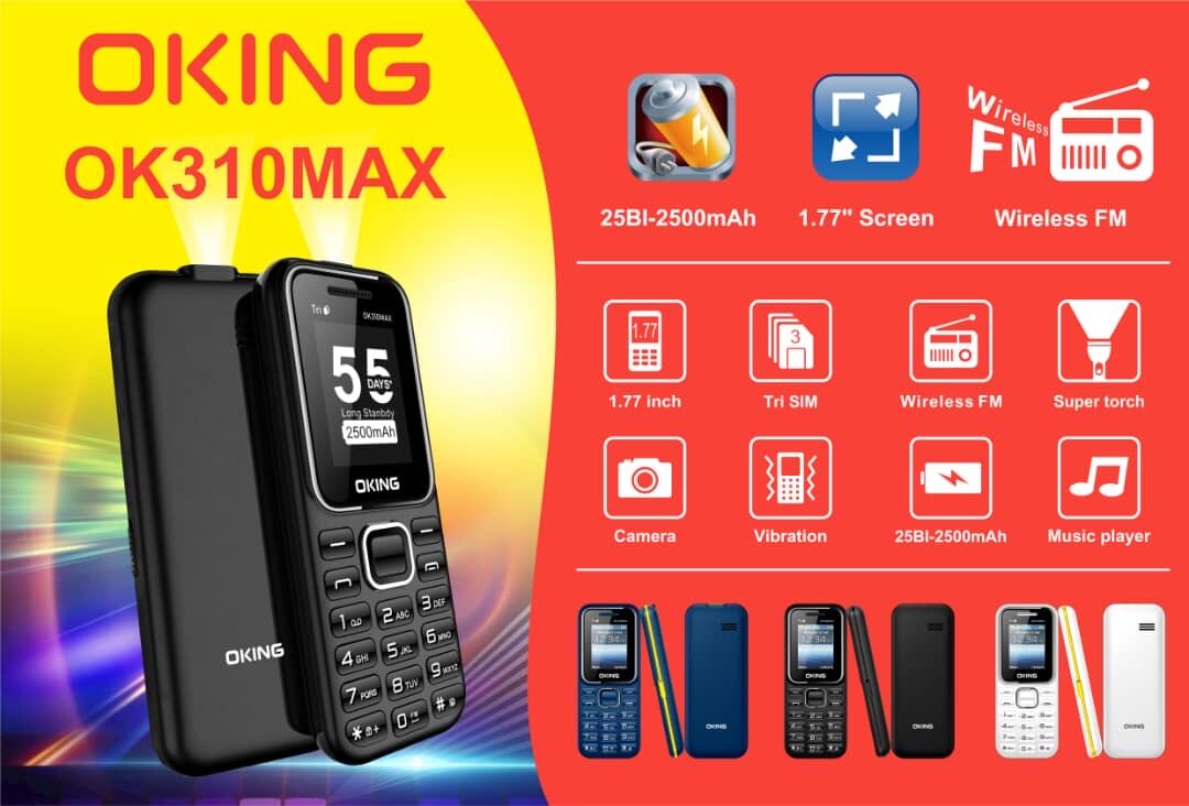 Découvrez le téléphone portable OKING OK310MAX avec écran 1.77 pouces, batterie puissante de 2500mAh, FM sans fil et compatibilité Tri SIM. Idéal pour une communication prolongée. Disponible en plusieurs couleurs.