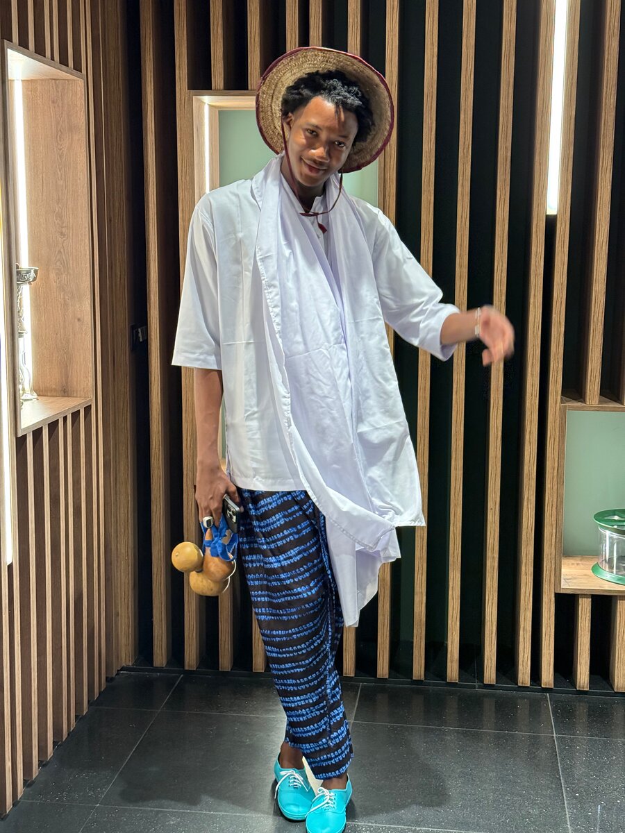 Découvrez cette tenue bohème pour homme, parfaite pour un look décontracté et stylé. Le chapeau en paille ajoute une touche classique tandis que la chemise blanche et les pantalons aux motifs bleus créent une harmonie moderne. Parfait pour un festival ou une journée ensoleillée en ville !