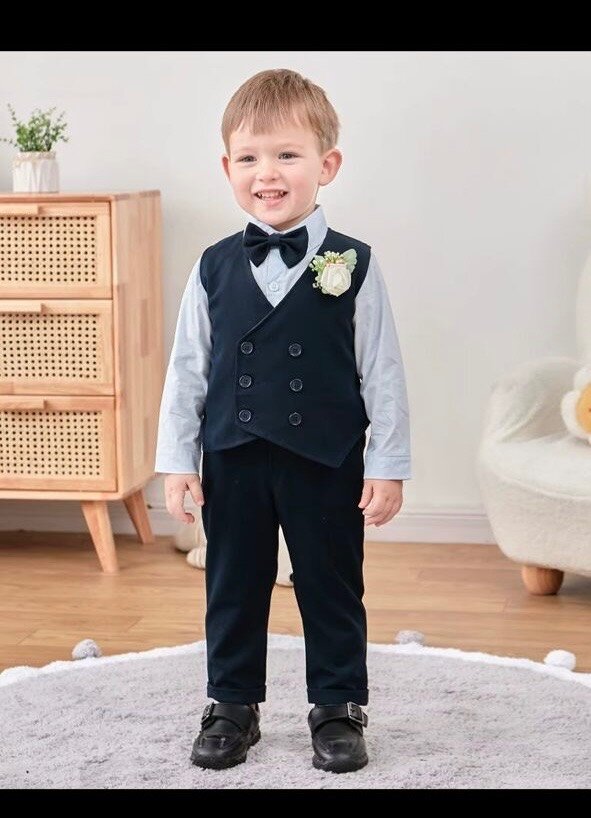 Cette élégante tenue de cérémonie pour garçon est parfaite pour les occasions spéciales. Composée d'un pantalon chic, d'une chemise blanche, d'un gilet assorti et d'un nœud papillon, elle est idéale pour les mariages ou les événements formels. Offrez à votre petit une allure distinguée et confortable lors des fêtes et célébrations. La qualité des matériaux garantit une tenue impeccable tout au long de la journée. Un choix parfait pour un look adorable et sophistiqué.