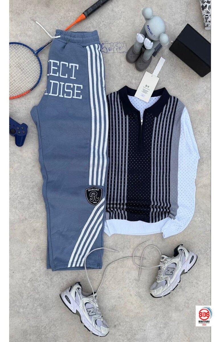 Ensemble sportif chic pour homme avec pantalon style rétro et polo à rayures. Confort et style assurés pour vos activités sportives et moments de détente. Idéal pour le tennis ou le jogging.