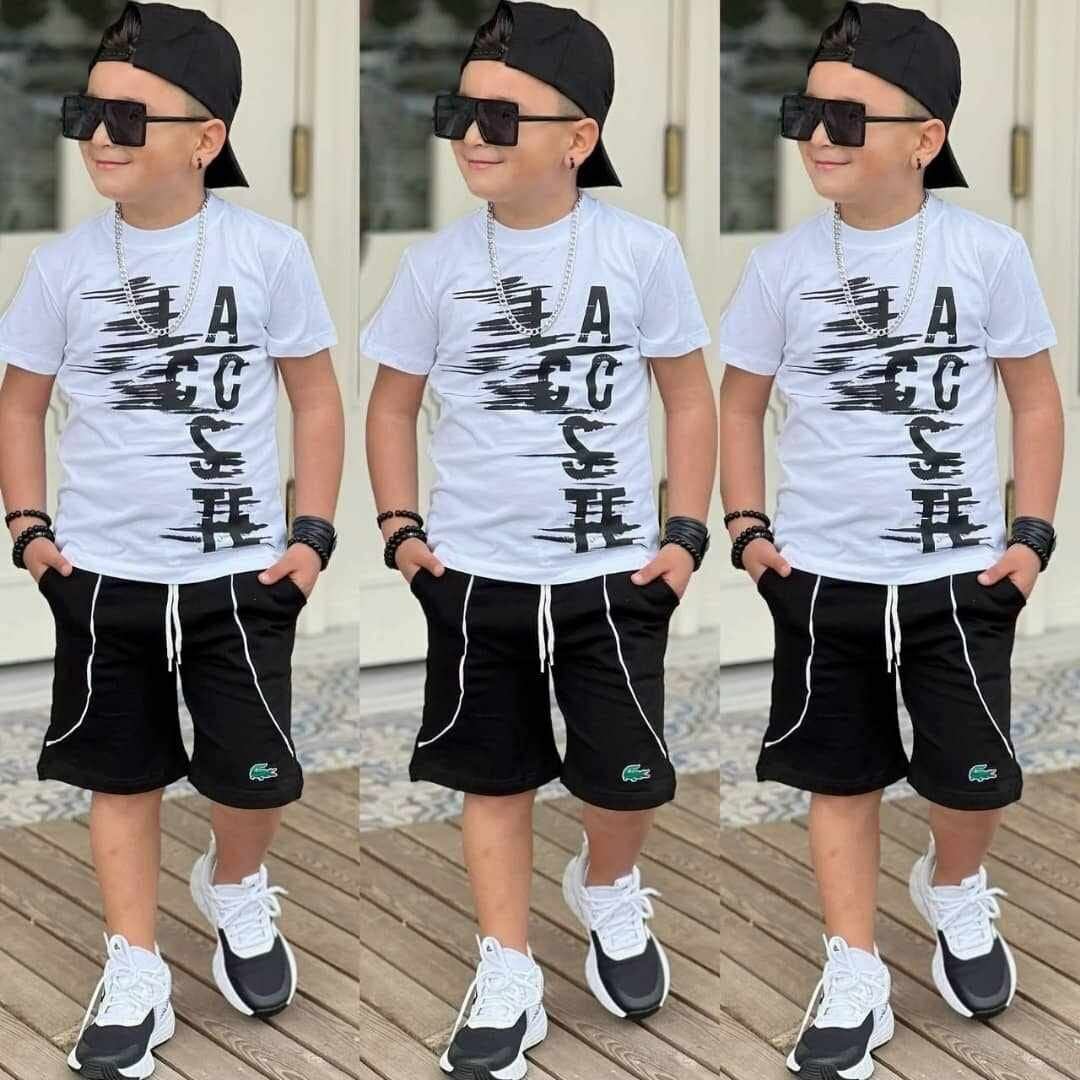 Optez pour ce look branché avec un t-shirt moderne et des shorts confortables. Parfait pour les sorties estivales et les après-midis de jeux.