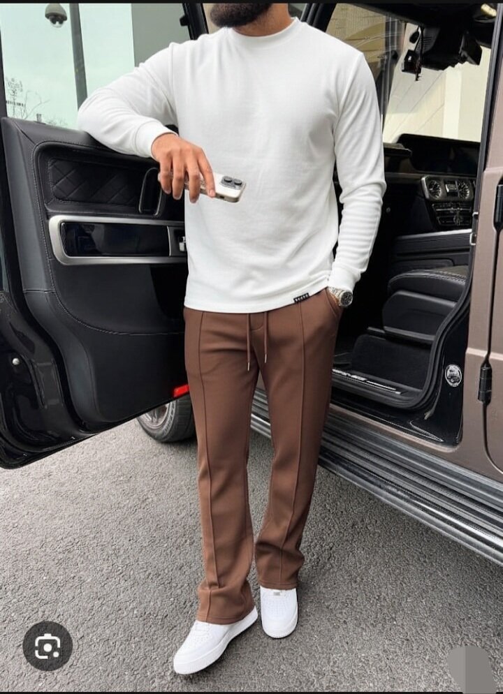 Découvrez cette tenue décontractée et élégante pour homme, composée d'un pull léger blanc et d'un pantalon marron confortable. Parfait pour une journée de détente ou une sortie en ville. Complétez votre look avec des baskets blanches pour une allure moderne et stylée.