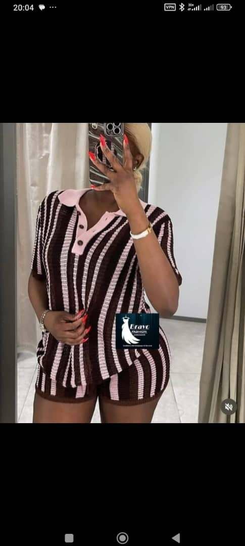 Adoptez un look tendance et confortable avec cette tenue décontractée rayée pour femmes. Composée d'un haut à col et d'un short assorti, elle est idéale pour des moments relax chez soi ou en sortie décontractée. Le tissu doux offre un confort optimal. Idéal pour un style casual chic.