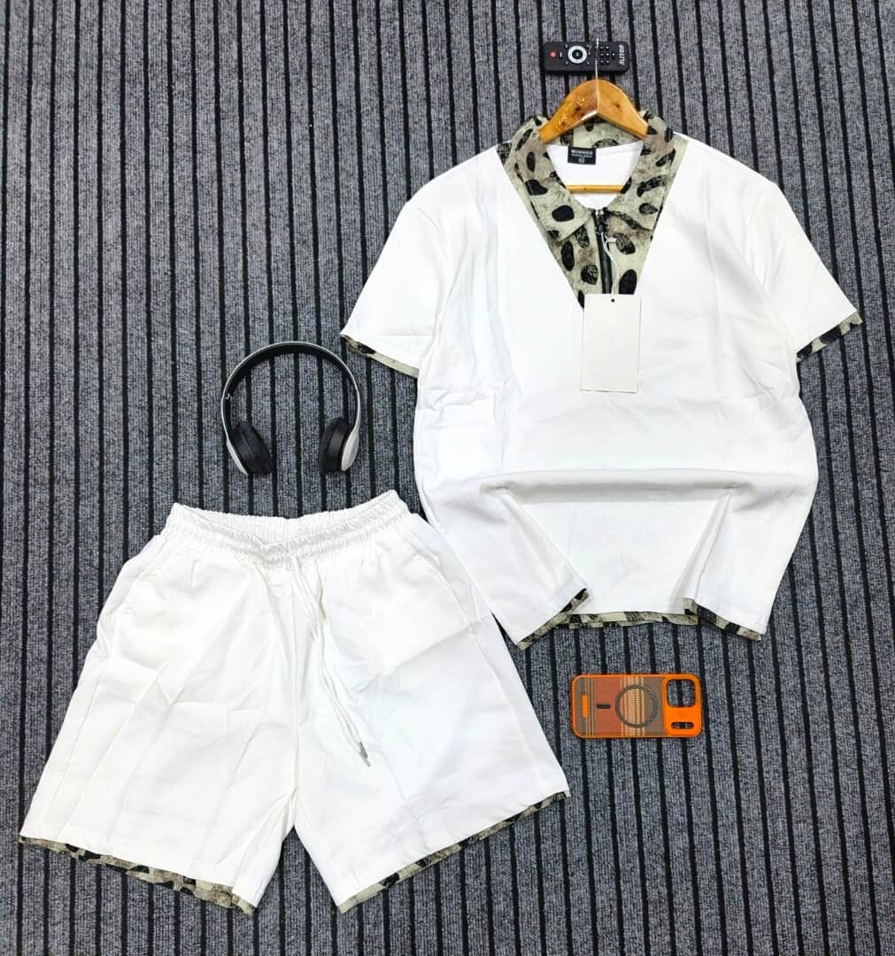 Ensemble d'été décontracté pour homme comprenant un t-shirt et un short assortis avec col léopard. Idéal pour un style urbain ou décontracté. Confortable et stylé, parfait pour les journées chaudes ou les sorties en ville. Matériaux légers pour un confort optimal.