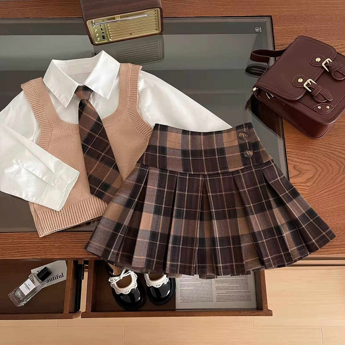 Cette élégante tenue d'écolière pour enfants comprend un chemisier blanc classique, un gilet à motif pied-de-poule et une jupe à carreaux à plis. Idéale pour des occasions spéciales ou la rentrée scolaire, cette tenue offre confort et style. Conçue pour les petites fashionistas, elle s'assortit parfaitement avec des accessoires sophistiqués. Parfaite pour une allure chic et soignée.