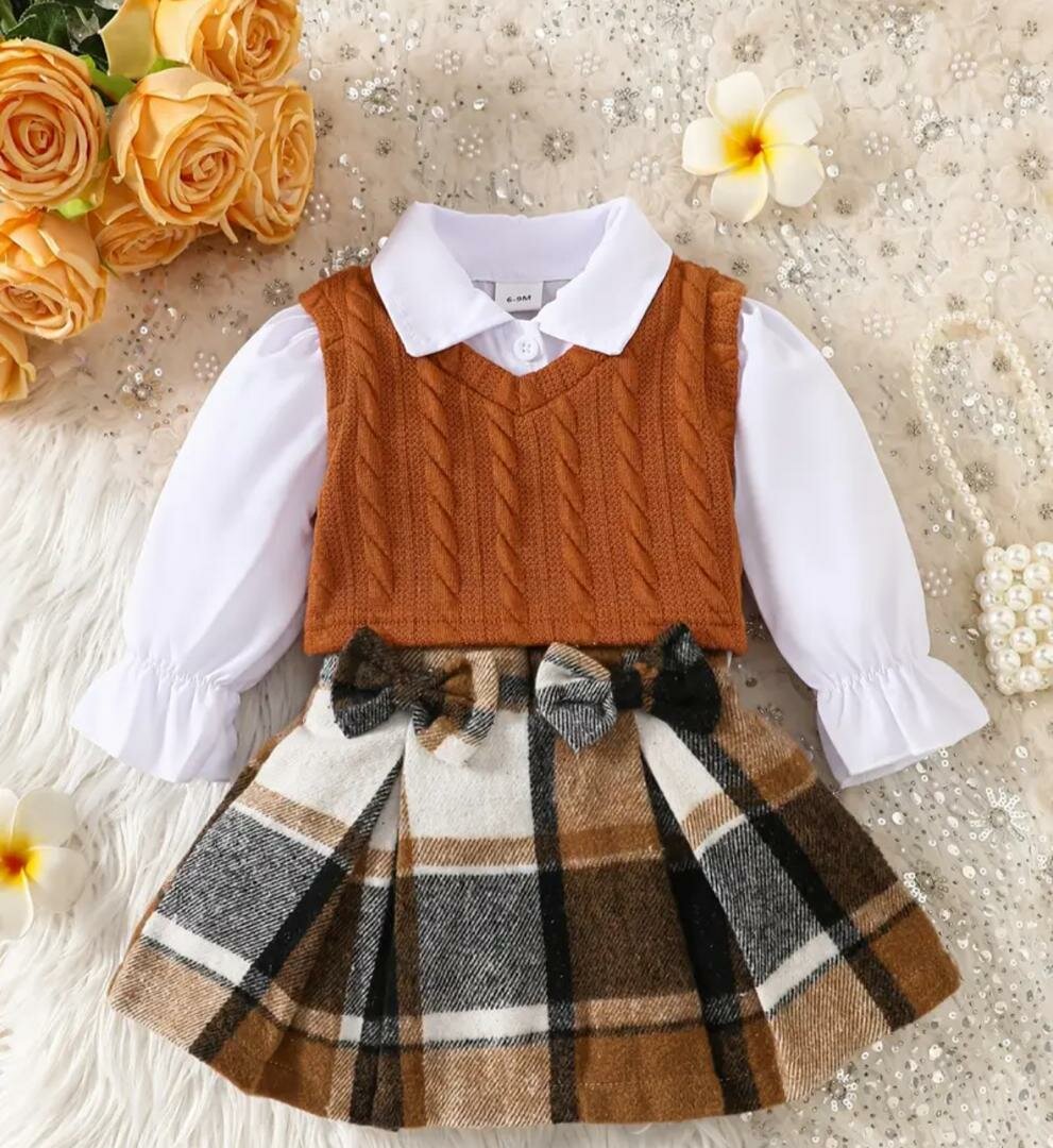 Parfaite pour les occasions spéciales, cette tenue pour bébé fille allie confort et style. Comprend un joli haut avec col et un pull sans manches en maille, assorti d'une jupe à carreaux. Idéale pour l'automne.