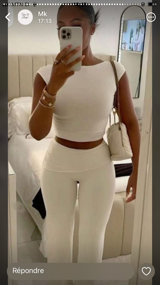 Élégante tenue blanche comprenant un haut court et un pantalon ajusté. Idéale pour une sortie estivale ou une soirée décontractée, cette tenue sublime votre silhouette avec simplicité et raffinement. Fabriquée avec des matériaux de qualité pour un confort optimal.