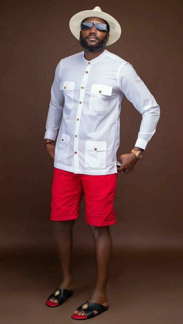 Cette tenue élégante d'été pour homme comprend une chemise blanche à manches longues avec des détails boutonnés, associée à un short rouge vif et à des sandales confortables. Idéale pour des occasions décontractées ou des sorties estivales tendance. Confort et style assurés!