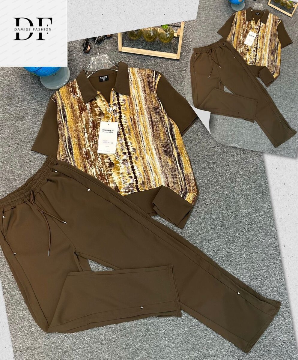 Optez pour un look chic et décontracté avec cette tenue élégante pour hommes. Le pantalon marron est complété par une chemise aux motifs marrons et dorés, parfaite pour une soirée ou une réunion informelle. Confort et style garantis.