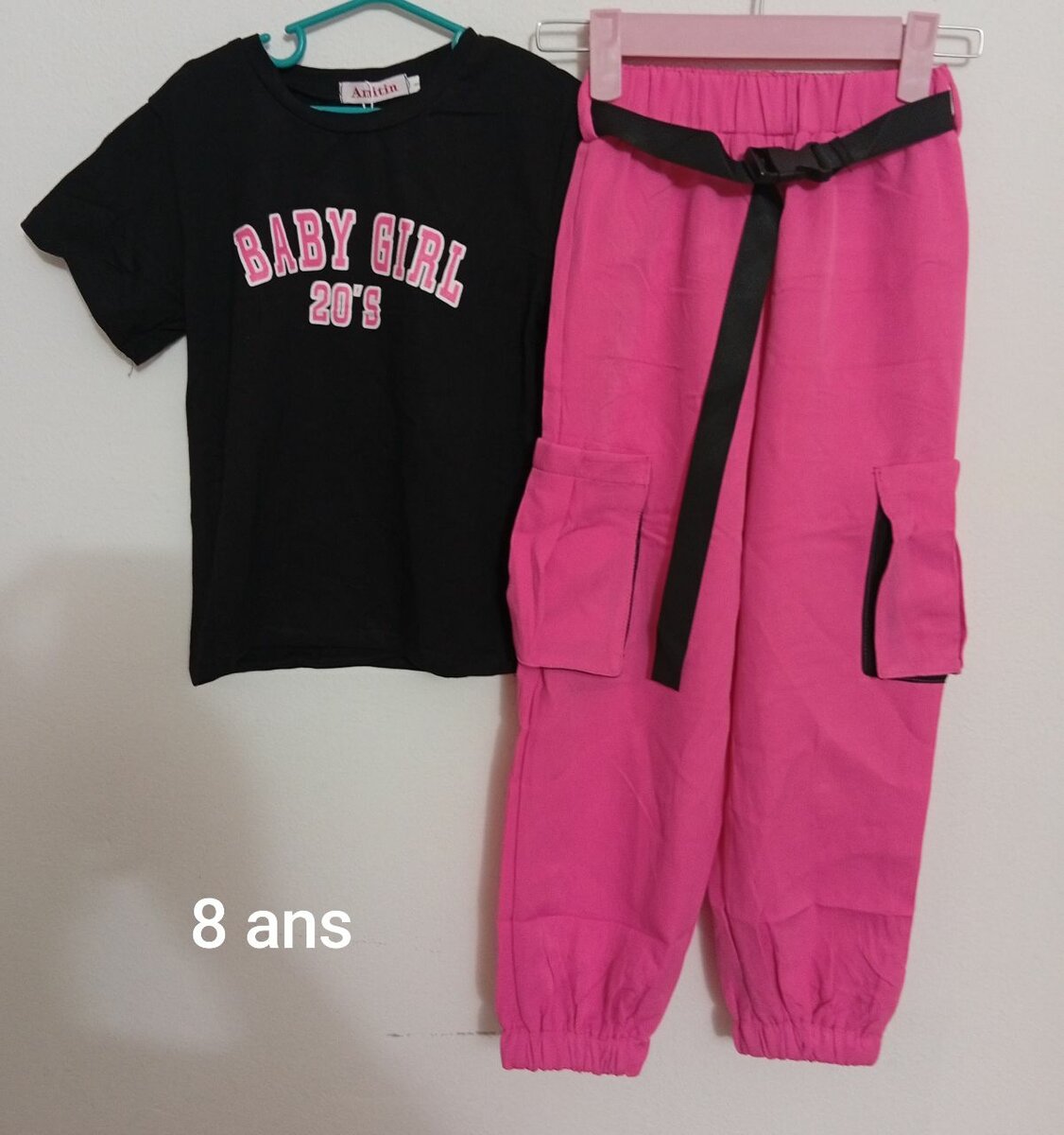 Tenue stylée pour filles de 8 ans avec t-shirt noir et pantalon rose vibrant. Idéale pour un look tendance et confortable au quotidien.