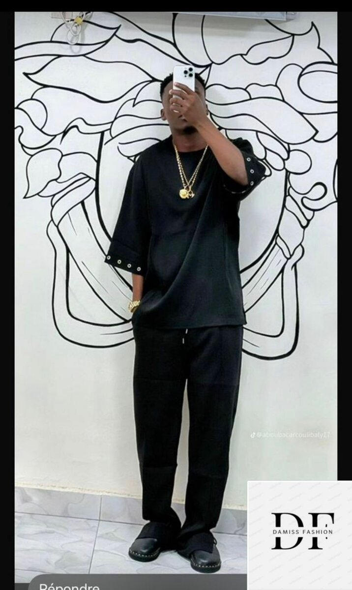 Optez pour cette tenue homme élégante et décontractée, idéale pour une sortie en ville ou un événement spécial. Confort et style assurés avec un t-shirt noir à manches courtes et un pantalon assorti. Un indispensable pour toute garde-robe moderne.
