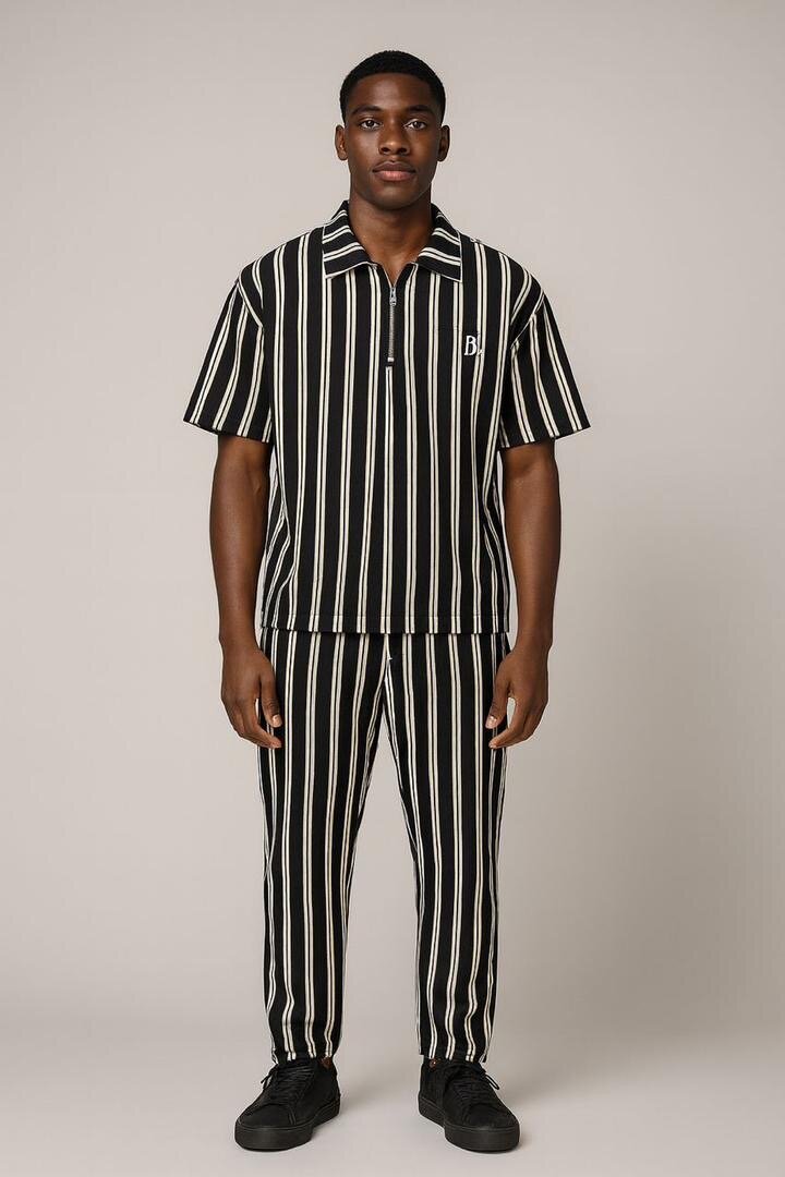 Adoptez un style audacieux avec cette tenue rayée pour homme. Parfaite pour un look décontracté ou une sortie stylée, elle offre confort et élégance. Idéale pour les saisons chaudes, elle est votre alliée mode incontournable.