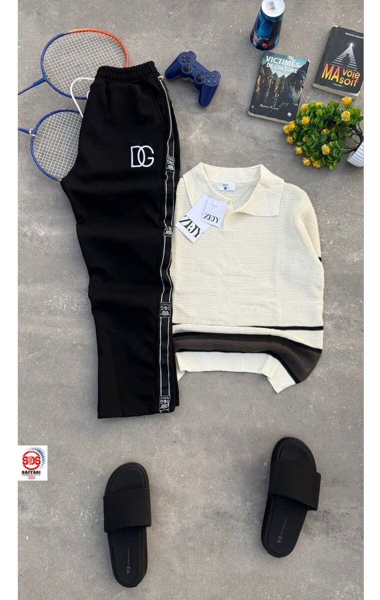 Découvrez cette tenue sportive sophistiquée pour homme, parfaite pour un look décontracté mais élégant. Composée d'un polo beige avec détails contrastants et d'un pantalon noir avec logo, elle offre confort et style. Idéale pour des occasions informelles ou une partie de tennis entre amis. Ajoutez une paire de chaussons pour compléter votre look décontracté. Un choix parfait pour allier mode et confort!