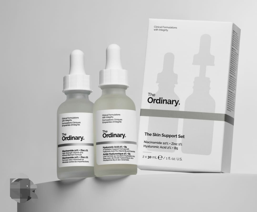 Contenu de l'ensemble de soutien cutané The Ordinary : Niacinamide 10 % + Zinc 1 % - 30 ml et Acide hyaluronique 2 % + B5 - 30