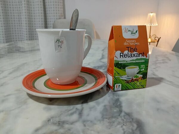 Thé relaxant naturel à base de bissap et menthe poivrée, boîte de 10 sachets individuels. Infusion rafraîchissante, 100% naturelle, parfaite pour la détente ou le bien-être quotidien. Goût unique, idéal à partager.