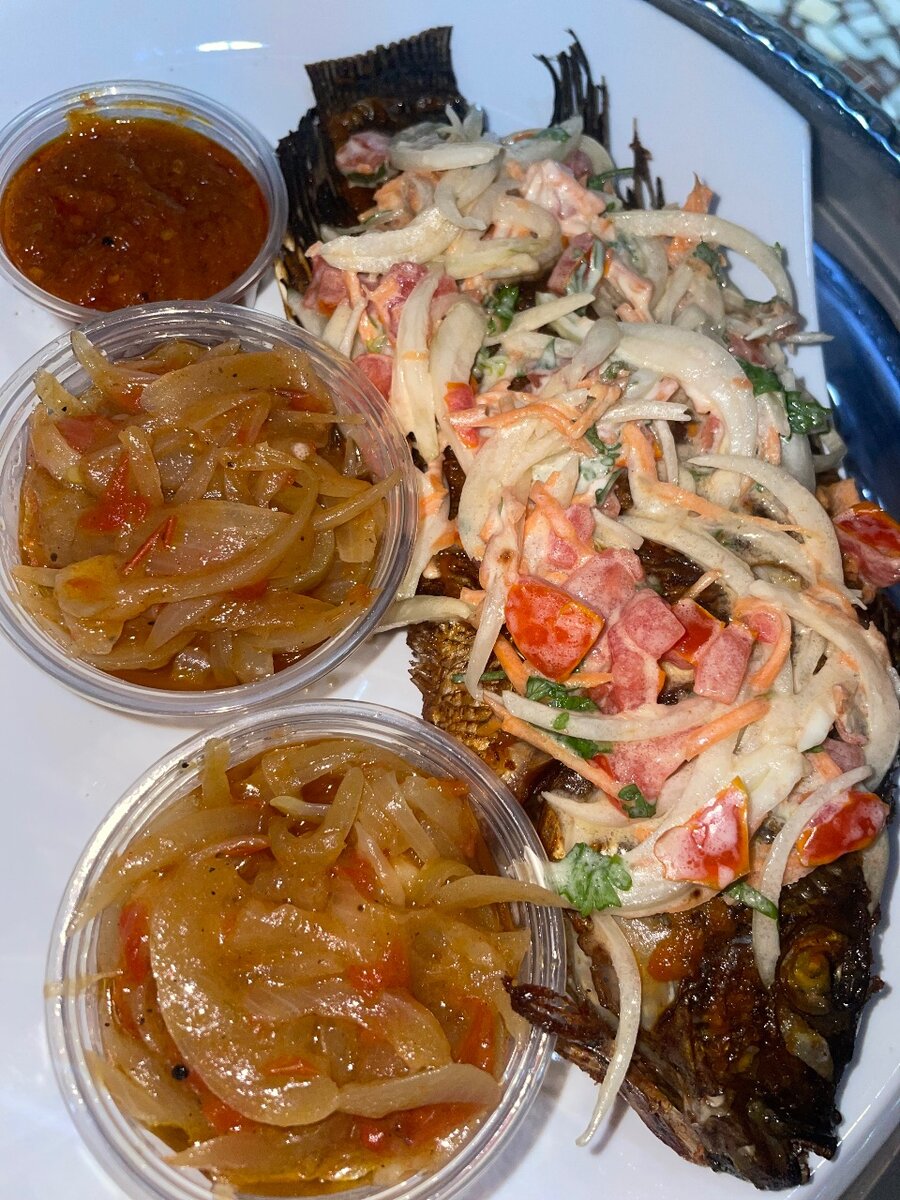 Découvrez notre succulent tilapia grillé, recouvert d'une salade de légumes frais, accompagnée de délicieuses sauces maison epicé. Parfait pour un dîner savoureux et équilibré. Idéal pour les amateurs de poisson à la recherche de saveurs authentiques et relevées.