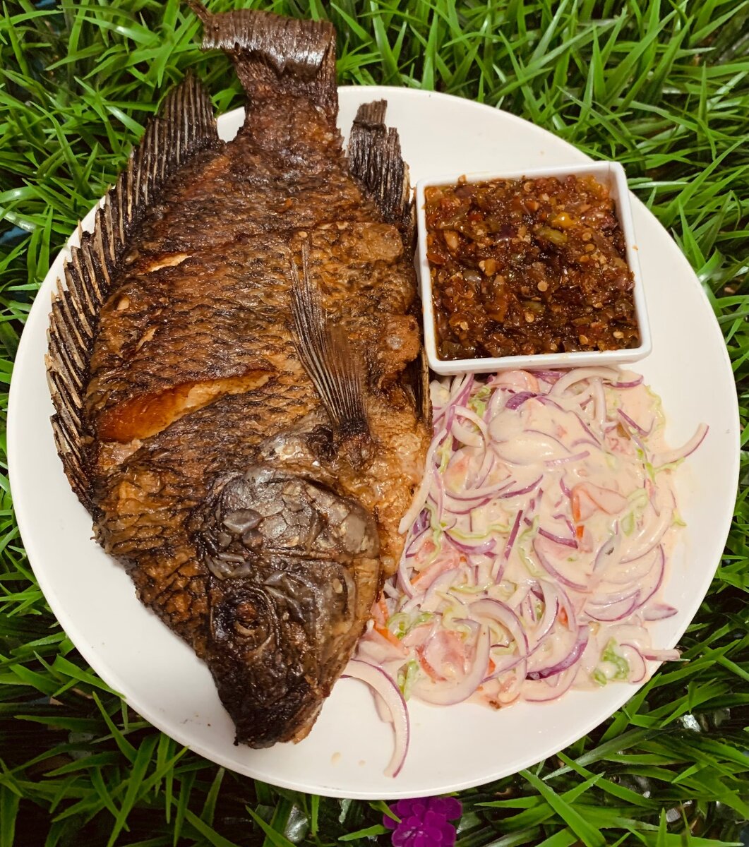 Savourez notre tilapia grillé épicé, préparé à la perfection avec des épices authentiques. Accompagné de légumes croquants et d'une sauce piquante, c'est le choix idéal pour un repas exotique et délicieux. Parfait pour partager en famille ou entre amis!