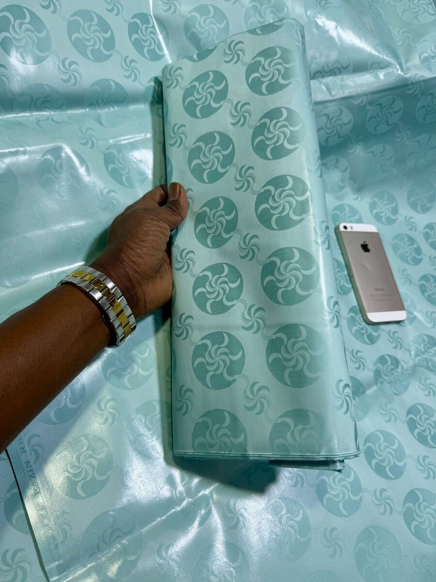 Magnifique tissu Adinkra en soie bleu clair, idéal pour les créations de mode ou la décoration d'intérieur. Léger et élégant.