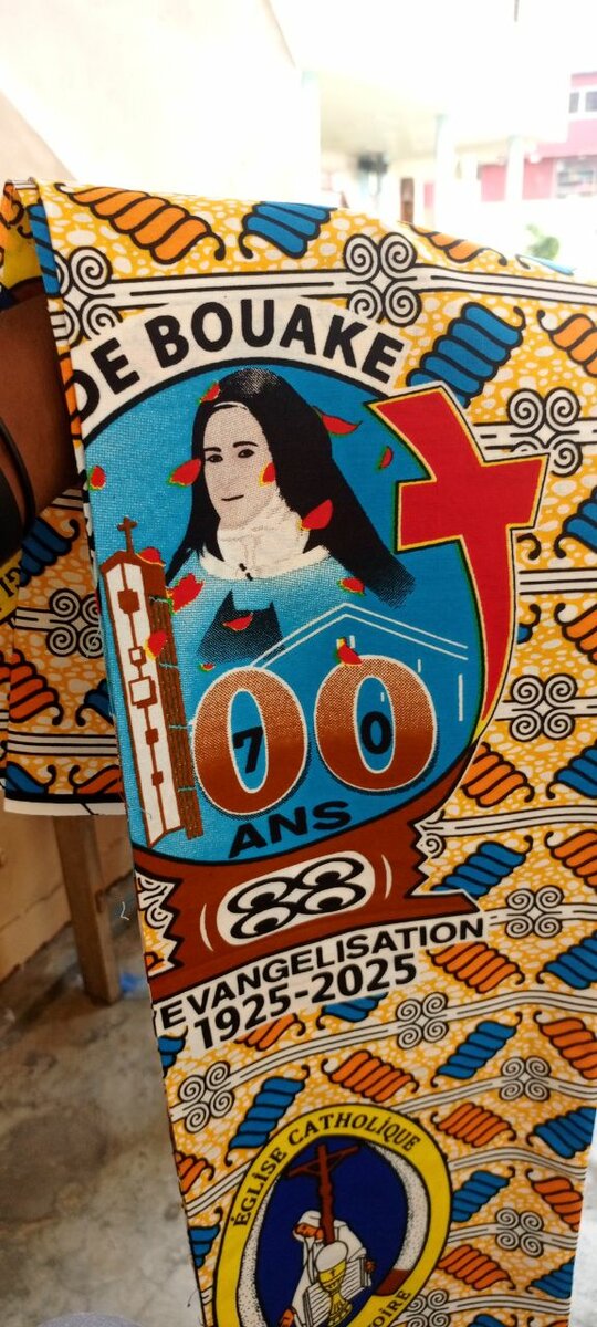 Célébrez un siècle d'évangélisation avec ce tissu commémoratif unique de Bouaké. Parfait pour des créations vestimentaires symboliques.