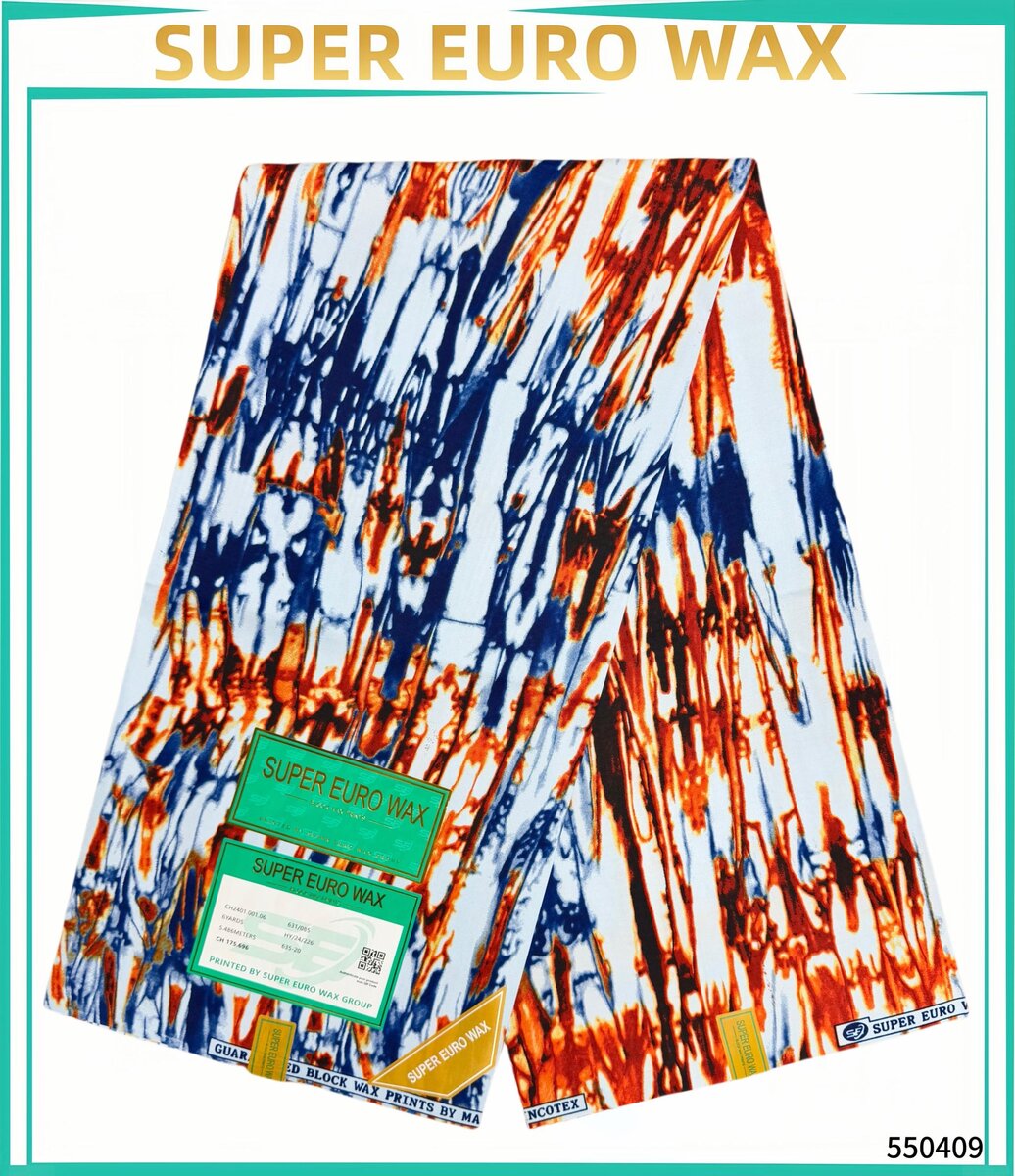 Découvrez le tissu en cire "Super Euro Wax" - un textile vibrant et coloré, idéal pour la couture créative et les vêtements uniques. Parfait pour créer des robes, chemises ou accessoires stylés. Conçu pour les passionnés de mode cherchant à se démarquer.