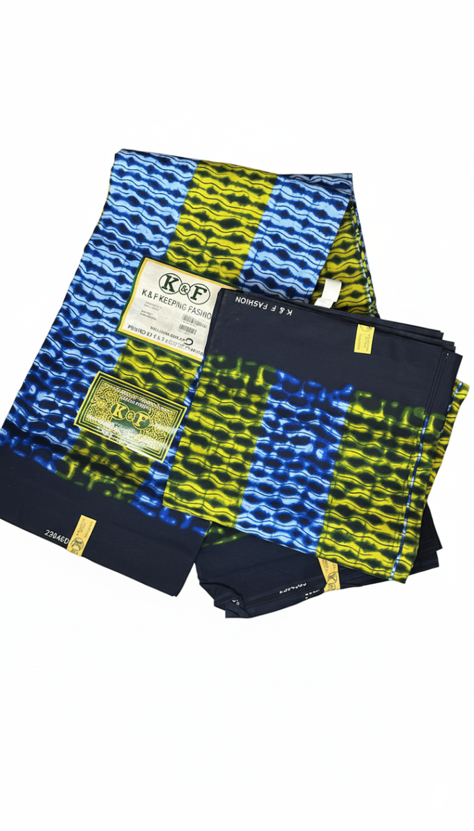 Découvrez ce délicat tissu wax en coton aux motifs vibrants de bleu et jaune. Parfait pour réaliser des tenues uniques ou des accessoires de mode.