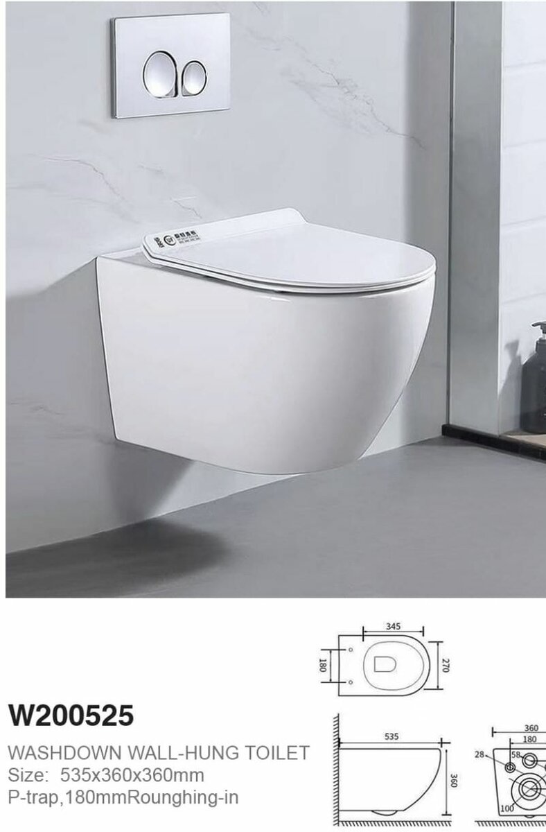 Toilette suspendue moderne W200525, conçue pour économiser de l'espace. Dimensions 535x360x360mm, P-trap, installation 180mm. Idéale pour une salle de bain épurée. Facile à nettoyer et à entretenir, elle apporte une touche contemporaine à votre maison.