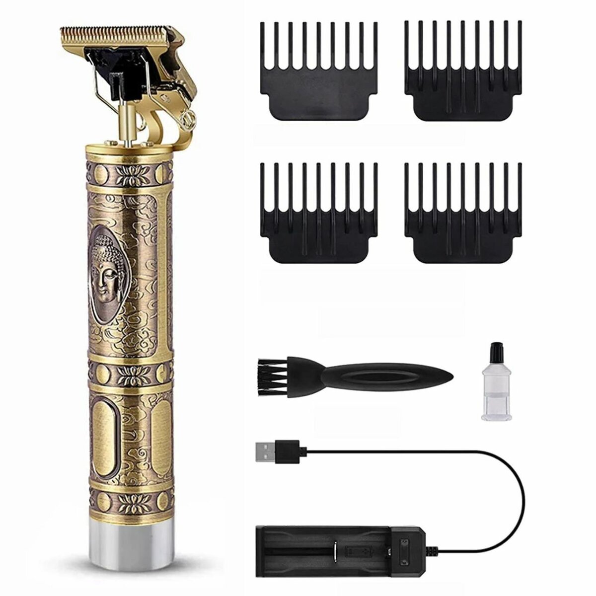 Tondeuse à cheveux rechargeable avec design vintage. Comprend plusieurs guides de coupe, brosse de nettoyage, huile et câble USB. Parfaite pour des styles précis et élégants. Idéale pour une utilisation à domicile ou professionnelle.
