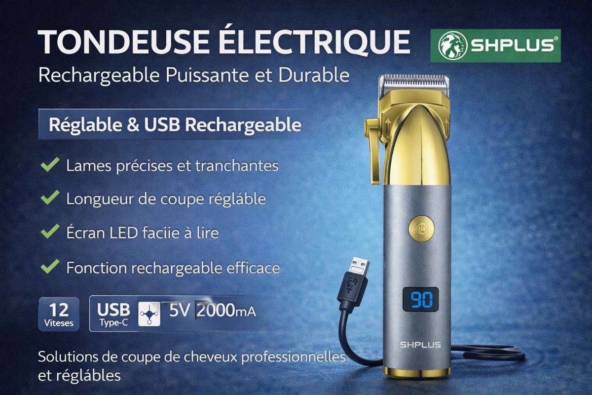 Tondeuse électrique rechargeable SHPLUS, idéale pour des coupes de cheveux précises et professionnelles. Avec 12 vitesses réglables, lames tranchantes et écran LED facile à lire. USB Type-C pour une recharge rapide et efficace, parfaite pour un usage à domicile ou en salon.