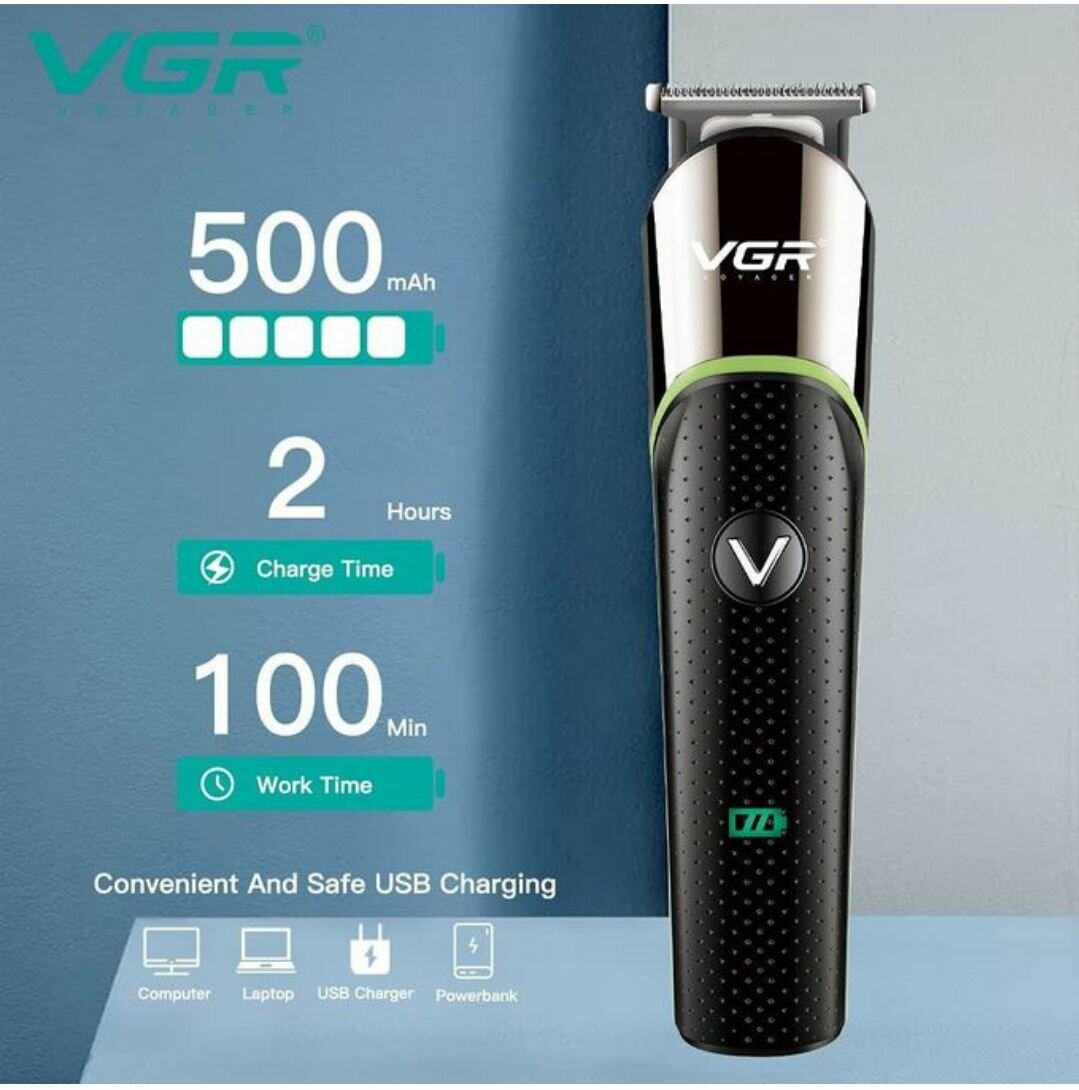 Découvrez la tondeuse VGR, dotée de lames précises et de guides de coupe ajustables. Parfaite pour une coupe professionnelle à domicile, elle offre une autonomie de 100 minutes après 2 heures de charge rapide. Par son design ergonomique et ses accessoires pratiques, elle est idéale pour créer différents styles. Achetez-la dès aujourd'hui pour une expérience de rasage parfaite!