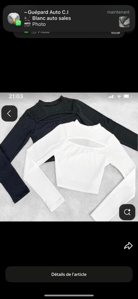 Découvrez ce top à manches longues et découpe élégante, idéal pour un look moderne et audacieux. Disponible en noir et blanc, il s'adapte à toutes vos tenues. Parfait pour des occasions spéciales ou un usage quotidien. Ne manquez pas cette pièce tendance et confortable!