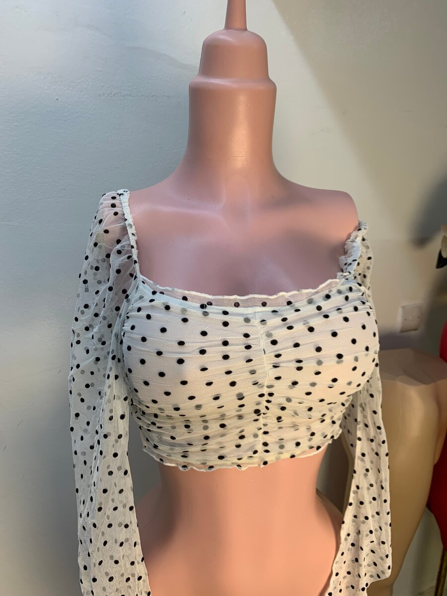 Chic et élégant, ce top à pois est idéal pour toutes occasions. Offrant un look moderne et seyant, il se distingue par ses manches longues transparentes et sa coupe ajustée qui valorise la silhouette. Parfait pour être porté avec un jean ou une jupe, il deviendra un incontournable de votre garde-robe.