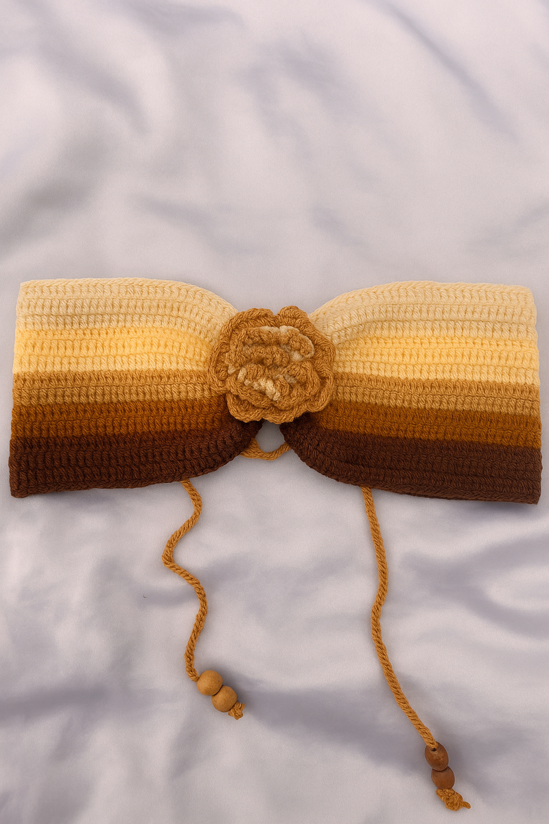 Charmant top crocheté aux nuances terreuses avec un ornement floral délicat. Parfait pour ajouter une touche bohème à votre tenue estivale.