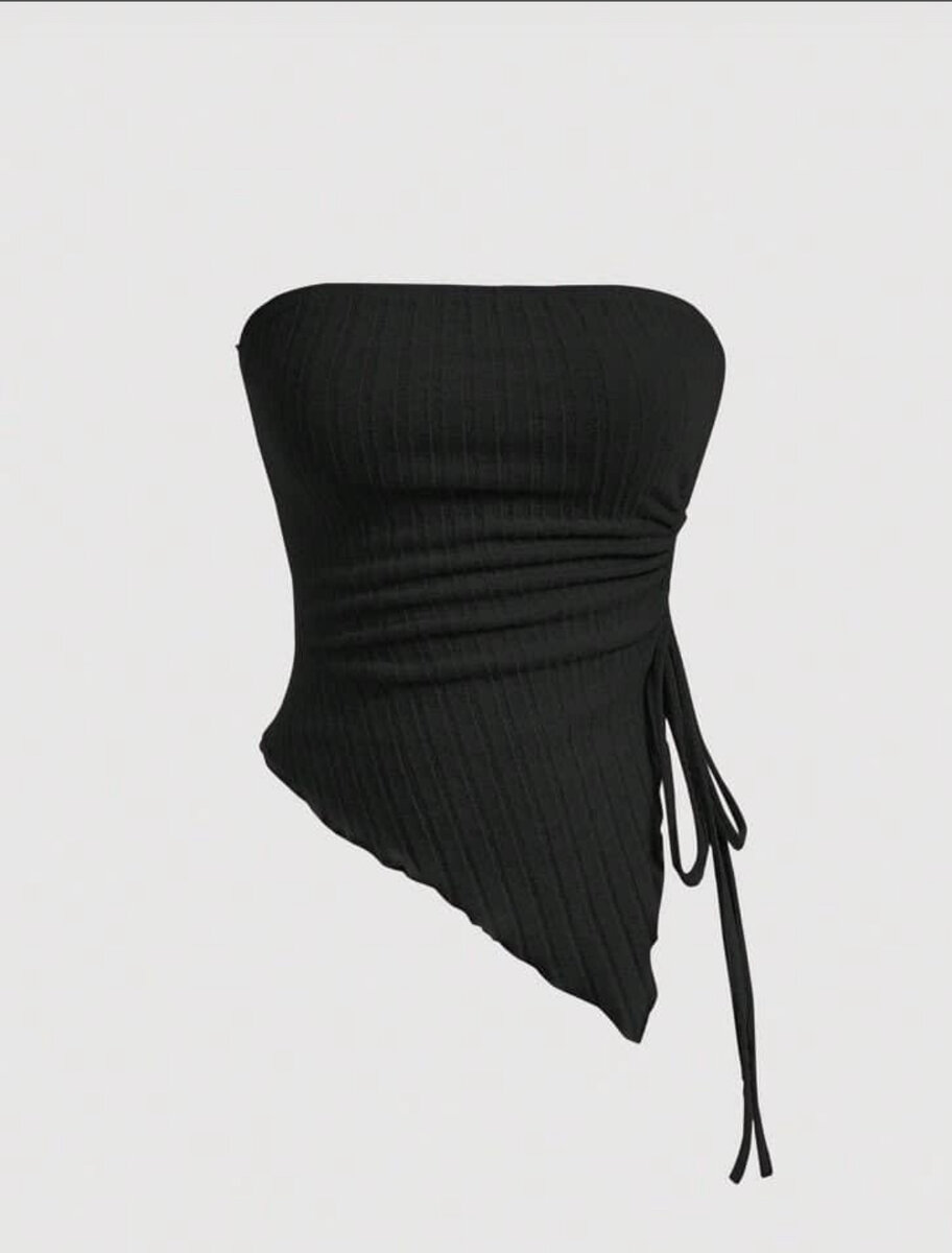 Adoptez un look glamour avec ce top bustier noir asymétrique. Idéal pour des soirées tendance, il met en valeur votre silhouette avec élégance. Fabriqué en tissu côtelé extensible, il offre un ajustement parfait et confortable. Parfait pour être associé à une jupe ou un pantalon pour un style chic.