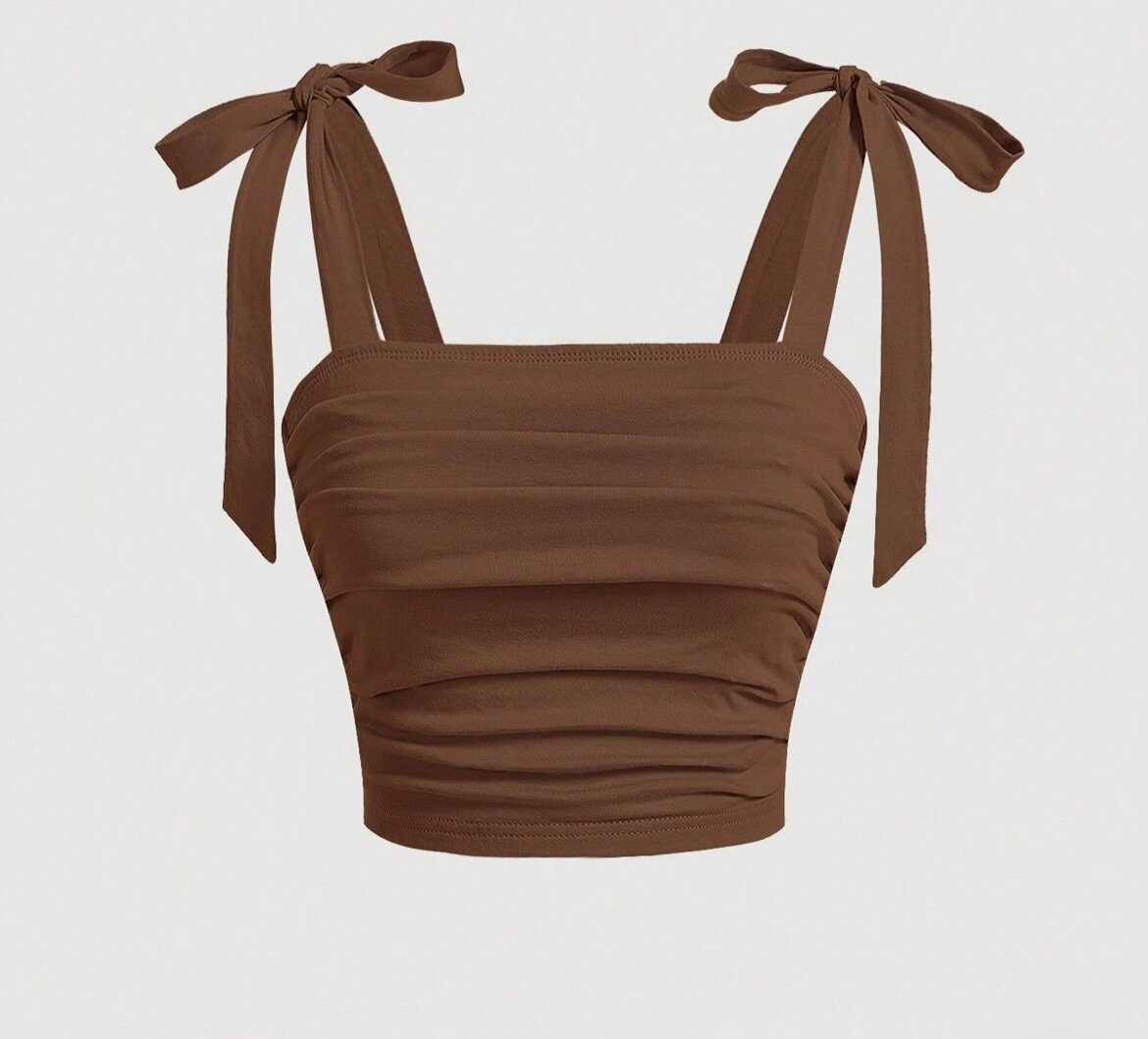 Découvrez ce top court marron à nouer aux épaules, parfait pour un look estival chic et décontracté. Son design froncé ajoute une touche de féminité, et le confort du tissu vous permettra de le porter toute la journée. Idéal pour les sorties entre amis ou les soirées décontractées, il s'adapte à de nombreuses occasions.