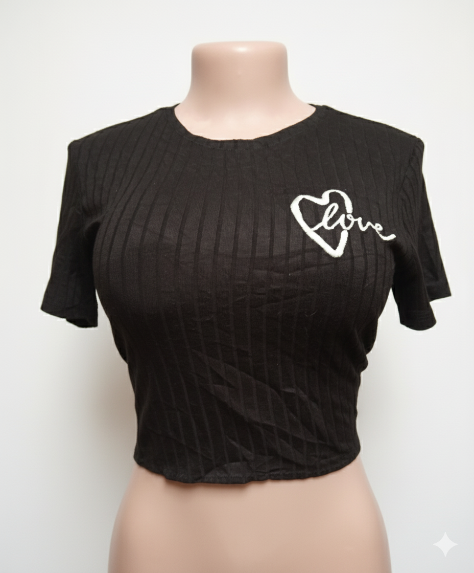 Découvrez ce top court noir avec motif cœur et inscription "love", parfait pour un style décontracté et chic. Idéal pour être porté en toute occasion, ce haut est doux et confortable, et se marie facilement avec toutes vos tenues.