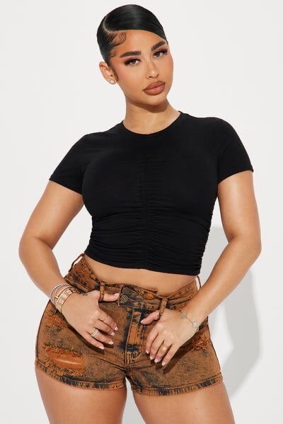 Découvrez ce top court noir, idéal pour un look moderne et élégant. Fabriqué dans un tissu confortable et extensible, il met en valeur votre silhouette avec sa coupe ajustée. Parfait pour être porté avec des shorts ou des jeans, ce top est un incontournable de votre garde-robe pour un style décontracté ou chic.