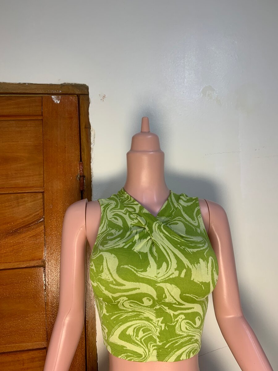 Adoptez un look estival avec ce top court vert vif à motif ondulé. Idéal pour un style décontracté, il se porte facilement avec une jupe ou un jean. Léger et confortable, c'est un choix parfait pour les journées chaudes.