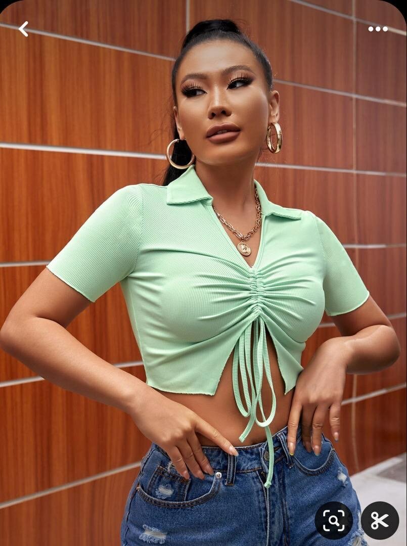 Explorez la mode avec ce top court vert, idéal pour les sorties décontractées. Conçu avec un lien central, qui permet d'ajuster le froncement pour un look personnalisable. Parfait avec un jean ou une jupe haute, ce top polyvalent ajoute une touche tendance à votre garde-robe. Matière douce et confortable pour un port quotidien.